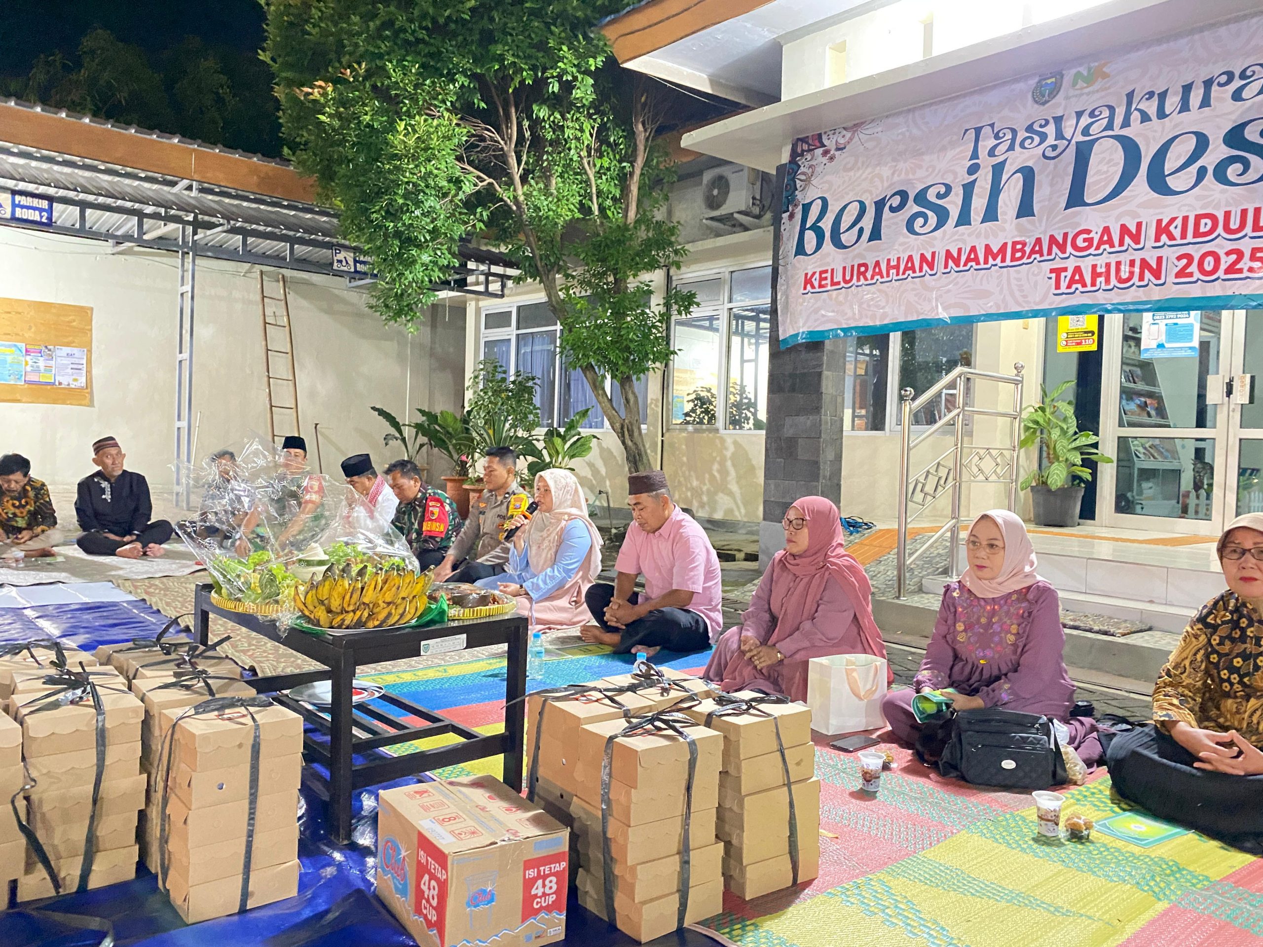 Kegiatan tasyakuran bersih desa yang di gelar di Halaman Kantor Kelurahan Nambangan Kidul ini dilakasanakan pada Jumat, (18/7) dan dihadiri oleh seluruh Ketua RT, RW, LPMK dan berbagai Tokoh Masyarakat serta Perangkat se Kelurahan Nambanghan Kidul